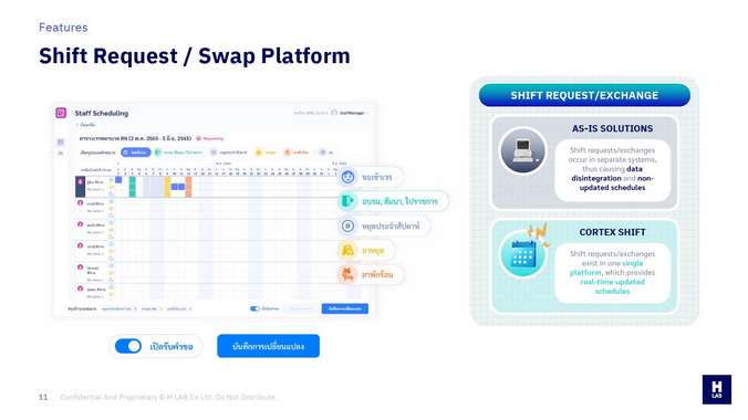 Cortex Shift by H-Lab สตาร์ทอัปไทยที่มีแนวคิดที่น่าสนใจมาก เพราะระบบนี้จะสามารถกรอกความต้องการของเจ้าหน้าที่แต่ละคน เช่น ช่วงไหนจะลาหยุด อยากได้เวรช่วงเวลาไหน
