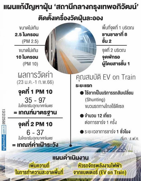 ข้อมูลจากการรถไฟแห่งประเทศไทย (รฟท.) กระทรวงคมนาคม เปิดเผยว่า ตามที่มีข้อเสนอแนะ ความคิดเห็น เกี่ยวกับประเด็นฝุ่นละอองที่เกิดขึ้นบริเวณชานชาลา ชั้น 2 สถานีกลางกรุงเทพอภิวัฒน์ ล่าสุด รฟท. ได้ประสานความร่วมมือไปยังกรมควบคุมมลพิษ เพื่อให้กองจัดการคุณภาพอากาศ และเสียง ลงพื้นที่ดำเนินการติดตั้งเครื่องตรวจวัดฝุ่นละอองขนาดไม่เกิน 2.5 ไมครอน (PM 2.5) และขนาดไม่เกิน 10 ไมครอน (PM 10) ในพื้นที่ของสถานีกลางกรุงเทพอภิวัฒน์ ระหว่างวันที่ 23 ม.ค.-1 ก.พ.2566 จำนวน 2 จุด ได้แก่ จุดที่ 1 บริเวณชานชาลาที่ 8 ชั้น 2 และจุดที่ 2 บริเวณจุดพักรอของผู้โดยสารชั้น 1 เพื่อติดตามตรวจสอบสถานการณ์ฝุ่นละอองของสถานีกลางกรุงเทพอภิวัฒน์