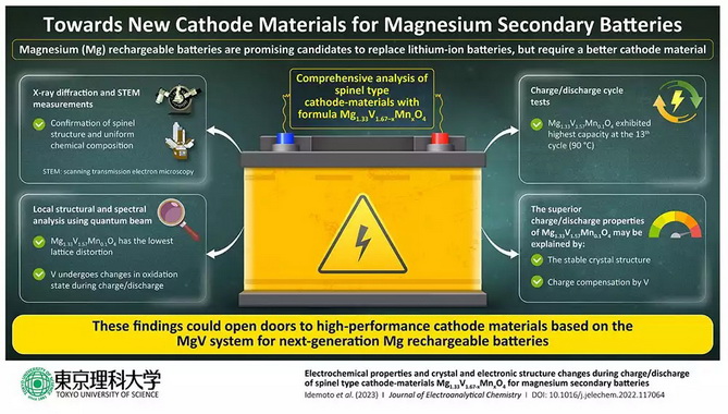 โดยศาสตราจารย์ Yasushi Idemoto ผู้นำทีมวิจัยจากมหาวิทยาลัยวิทยาศาสตร์โตเกียว ได้ทำการปรับโครงสร้างสารประกอบแมกนีเซียม (Mg) ด้วยการแทนที่วานาเดียม (V) บางส่วนด้วยแมงกานีส (Mn) ซึ่งการปรับโครงสร้างของสารประกอบดังกล่าวได้ปรับปรุงคุณสมบัติการปล่อยประจุ และเนื่องจากแมกนีเซียมมีความหนาแน่นของพลังงานสูงกว่าลิเทียม จึงคุ้มค่าที่จะเลือกใช้แทนลิเทียม
