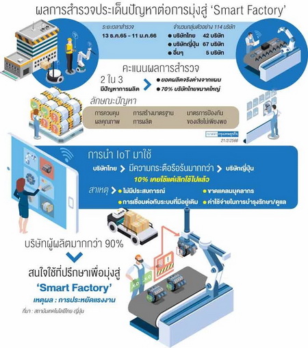 ในส่วนผลการสำรวจประเด็นปัญหาต่อการมุ่งสู่ “Smart Factory“ ซึ่งเป็นหนึ่งในกรอบความร่วมมือไทย-ญี่ปุ่น ซึ่งมีจุดประสงค์เพื่อแจกแจงสถานการณ์ปัจจุบัน และประเด็นปัญหาต่อการมุ่งสู่ Smart Factory ของบริษัทผู้ผลิตในประเทศไทย และสำรวจความต้องการต่อ “โครงการ Smart Monodzukuri Support Team” ที่สนับสนุนการมุ่งสู่ Smart Factory ที่ “เหมาะสมกับขนาดและสภาพ” ของบริษัท โดยดำเนินการสำรวจ เมื่อ13 ธ.ค. 2565 – 11 ม.ค. 2566 รูปแบบส่งแบบสอบถามให้ตอบทางเว็บให้แก่บริษัทผู้ผลิตที่ดำเนินธุรกิจในไทย มีจำนวนบริษัทที่ตอบแบบสอบถาม 119 บริษัท ในจำนวนนั้น 5 บริษัทไม่ใช่บริษัทผู้ผลิต จึงถือเป็นโมฆะ และนับกลุ่มตัวเองของแบบสำรวจที่ 114 บริษัท แบ่งเป็น บริษัทไทย : 42 บริษัท ,บริษัทญี่ปุ่น : 67 บริษัท, อื่น ๆ : 5 บริษัท