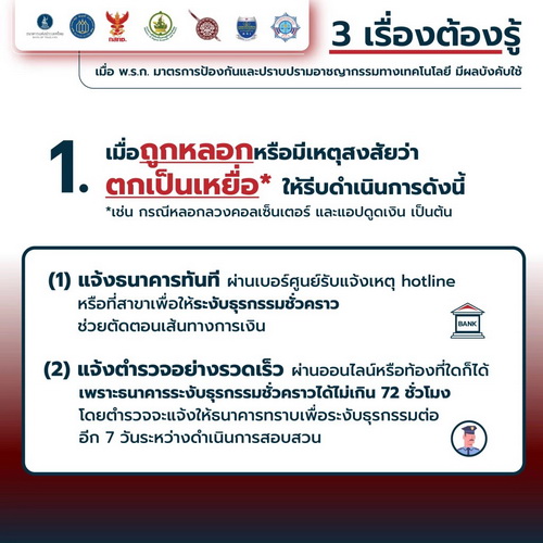 1 เมื่อถูกหลอกหรือมีเหตุสงสัยว่าตกเป็นเหยื่อ* ให้รีบดำเนินการดังนี้