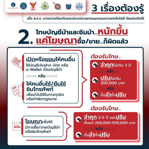 โฆษณาเพื่อให้ มีการซื้อ/ขายบัญชีม้า หรือซิมโทรศัพท์ ต้องรับโทษ จำคุก 2-5 ปี และปรับ ตั้งแต่ 200,000-500,000 บาท หรือ ทั้งจำทั้งปรับ