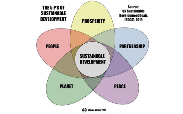 เป้าหมายการพัฒนาทั้ง 17 ข้อ สะท้อน ‘3 เสาหลักของมิติความยั่งยืน’ (Three Pillars of Sustainability) คือ มิติด้านสังคม เศรษฐกิจ และสิ่งแวดล้อม บวกกับอีก 2 มิติ คือ มิติด้านสันติภาพและสถาบัน และมิติด้านหุ้นส่วนการพัฒนา ที่เชื่อมร้อยทุกมิติของความยั่งยืนไว้ด้วยกัน รวมเป็น 5 มิติ องค์การสหประชาชาติแบ่งเป้าหมาย 17 ข้อ ออกเป็น 5 กลุ่ม (เรียกว่า 5 Ps) ประกอบด้วย