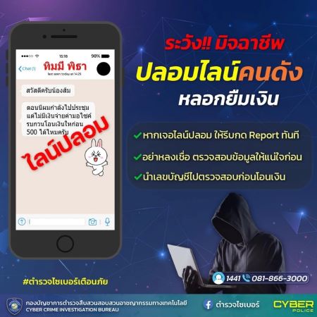 ตำรวจไซเบอร์เตือนภัย ระวังมิจฉาชีพ ปลอมไลน์คนดัง หลอกยืมเงิน พร้อมชี้กลโกง ใช้ภาพและโปรไฟล์ไลน์สวมเป็นคนมีชื่อเสียง พร้อมข้อสังเกต และ แนวทางป้องกันไม่ให้โดนหลอกโอนเงิน