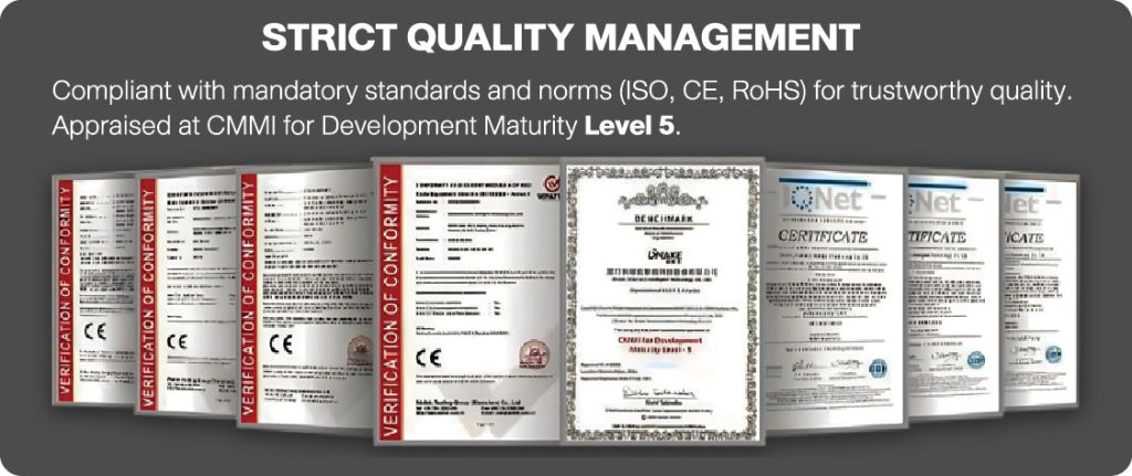 ด้วยประสบการณ์ในการผลิต (ภายใต้การควบคุม IQC, OQC, PQC) ได้รับมาตรฐานการรับรอง CE, RoHS โดยจัดจำหน่ายสินค้าประเภท VDO Intercom ยาวนานกว่า 18 ปีและ 90 ประเทศทั่วโลก อาทิเช่น สหรัฐอเมริกา เยอรมนี รัสเซีย ออสเตรเลีย ญี่ปุ่น เกาหลี อิสราเอล และแอฟริกาใต้ เป็นต้น