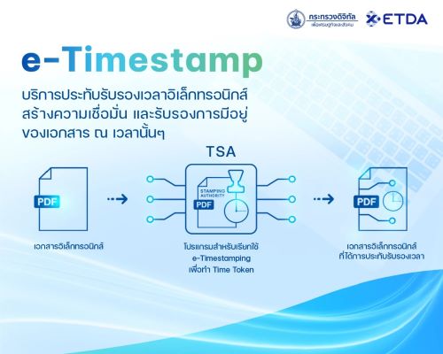 2) บริการ e-Timestamp เป็นการประทับรับรองเวลาอิเล็กทรอนิกส์ เพื่อสร้างความเชื่อมั่นและรับรองการมีอยู่ของเอกสาร ณ เวลานั้นๆ เช่นเดียวกับการประทับตรายางหมึกที่สำนักงานต่างๆ มักใช้ประทับเวลาเมื่อได้รับเอกสารต่างๆ โดยใช้เทคโนโลยี Timestamping Authority (TSA) ที่มีความน่าเชื่อถือและมีการตรวจสอบความถูกต้องของเวลาที่ใช้อ้างอิง สามารถใช้ประกอบการลงลายมือชื่ออิเล็กทรอนิกส์ หรือเพื่อรับรองการมีอยู่ของเอกสาร ซึ่ง TSA จะเป็นเสมือนพยาน หรือบุคคลที่ 3 ที่เชื่อถือได้ เนื่องจากไม่ได้มีส่วนได้ส่วนเสียกับเอกสารดังกล่าว อีกทั้งสามารถใช้ในการตรวจสอบว่าเอกสารอิเล็กทรอนิกส์ที่ได้รับการประทับรับรองเวลาแล้วนั้น ถูกแก้ไขหรือไม่ โดยปี 2566 เฉพาะเดือนมกราคม-มีนาคม ดำเนินการจัดการข้อมูลไปแล้ว รวม 655,945 ข้อมูล ทั้งนี้ ในส่วนบริการ e-Timestamp ตั้งแต่วันที่ 30 กันยายน 2566 เป็นต้นไป ETDA จะปรับการทำงานจากผู้ให้บริการโดยตรง ถอยมาเป็นผู้โปรโมตทางอ้อมแทน เพื่อทำหน้าที่นำประสบการณ์การใช้และเข้าใจประเด็นปัญหาการใช้ รูปแบบการใช้งานหรือการให้บริการแบบไหนที่เหมาะสม ไปผลักดันผู้ให้บริการรายอื่น ซึ่งปัจจุบันมีขึ้นแล้วราว 2-3 ราย จัดทำให้เกิด Trust Service ที่จะไปตอบโจทย์ พระราชบัญญัติการปฏิบัติราชการทางอิเล็กทรอนิกส์ พ.ศ. 2565