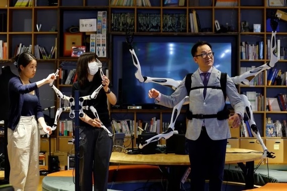 นักวิทยาศาสตร์ ม.โตเกียว ประเทศญี่ปุ่น ประดิษฐ์ “แขนกลหุ่นยนต์” สวมใส่-ถอดเปลี่ยนได้มากถึง 6 แขน หวังผนวกมนุษย์กับจักรกลหลายแขนทำงานร่วมกันในอนาคต