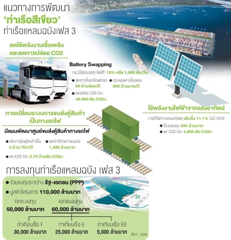 รัฐบาลดันท่าเรือแหลมฉบังเฟส 3 เป็นท่าเรืออัจฉริยะสีเขียว วาง 3 แนวทางลดการปล่อยคาร์บอน – ใช้เชื้อเพลิงสะอาดในโครงการ คาดสร้างเม็ดเงินให้ผู้ประกอบการในซัพพลายเชนรถไฟฟ้า และแบตเตอรี่ได้ไม่น้อยกว่า 1.8 หมื่นล้าน ส่วนสถานะก่อสร้างปัจจุบันล่าช้า 2 ปีจากการถมทะเลล่าช้า