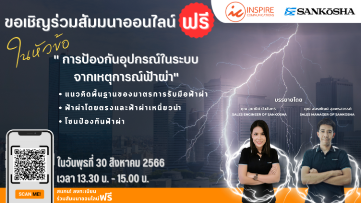 Inspire Communications Co., Ltd. ร่วมกับ SANKOSHA แบรนด์อันดับหนึ่งในประเทศญี่ปุ่น ด้านเทคโนโลยีระบบป้องกันฟ้าผ่า ขอเชิญร่วมสัมมนาออนไลน์ ฟรี!! ในหัวข้อ “การป้องกันอุปกรณ์ในระบบจากเหตุการณ์ฟ้าผ่า”