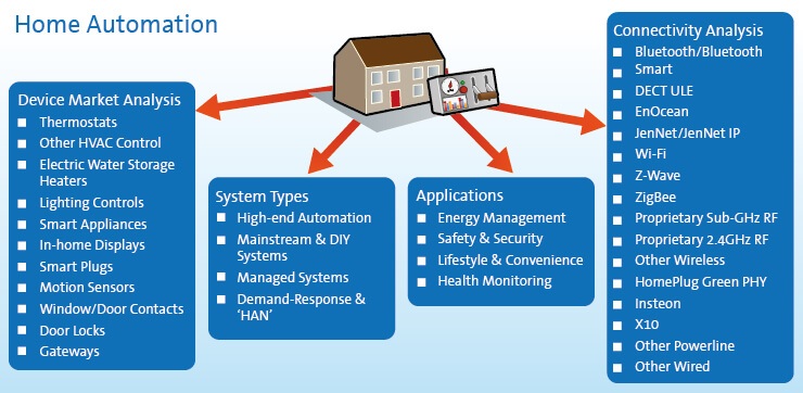 4. เพื่อดูแลสุขภาพของผู้อาศัยภายในบ้าน เช่นจะติดตั้งเซนเซอร์ตรวจคลื่นหัวใจ ตรวจจับไฟไหม้ โดยส่งสัญญาณ เมื่อเวลาเกิดเหตุการณ์ที่ผิดปกติ