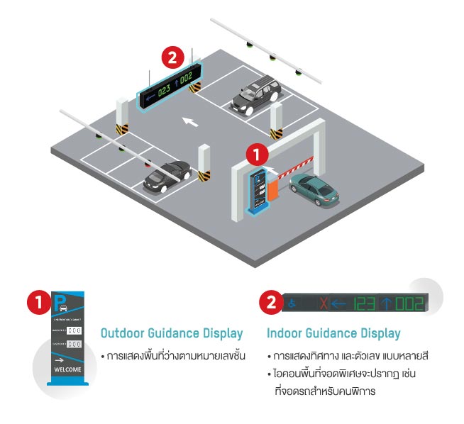 ระบบการแนะนำที่จอดรถอัจฉริยะ สามารถให้คำแนะนำพื้นที่ว่างได้อย่างชัดเจน สำหรับการจอดรถที่มีประสิทธิภาพ โดยระบบนี้รับข้อมูลจากกล้องการแนะนำการจอดรถ แสดงจำนวนและตำแหน่งของพื้นที่ว่างทั้งหมดบนหน้าจอ LED แบบติดตั้งภายนอกและภายในอาคารจอดรถ