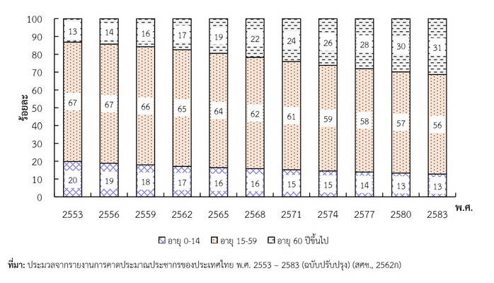 โดยเริ่มตั้งแต่ปี พ.ศ. 2553 เป็นต้นมา จำนวนสัดส่วนประชากรเพิ่มสูงขึ้นอย่างต่อเนื่องและมีแนวโน้มสูงขึ้นเรื่อย ๆ ในแต่ละปี และหากอิงตามโครงสร้างประชากรของประเทศไทย คาดการณ์ว่าประเทศไทยกำลังก้าวเข้าสู่สังคมสูงวัยโดยสมบูรณ์ (Aged Society) ในปี พ.ศ. 2566 อ้างอิงจากข้อมูลสำนักงานสภาพัฒนาการเศรษฐกิจและสังคมแห่งชาติ (สคช.) และกรมการปกครองถึงจำนวนผู้สูงอายุในปี พ.ศ. 2561 พบว่ามีผู้สูงอายุประมาณ 10.67 ล้านคน คิดเป็นอัตราส่วนผู้สูงอายุร้อยละ 16.46 และในปี พ.ศ. 2562 มีจำนวนผู้สูงอายุ 11.13 ล้านคน คิดเป็นร้อยละ 16.73 จากจำนวนประชากรของประเทศไทยทั้งหมด ดังในรูปที่ 1