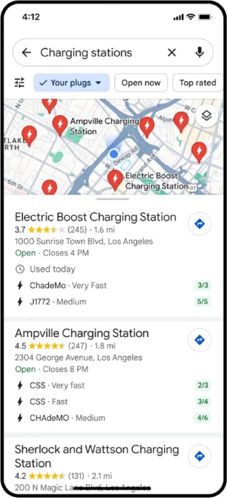 อีกหนึ่งฟีเจอร์ที่น่าสนใจ สำหรับคนขับขี่รถยนต์ไฟฟ้า Google Maps ได้เพิ่มฟีเจอร์ค้นหาสถานีชาร์จรถยนต์ไฟฟ้า EV พร้อมทั้งให้รายละเอียดต่างๆ เช่น ประเภทของหัวชาร์จว่าใช้งานได้กับรถยนต์ของเราหรือไม่, ความเร็วในการชาร์จของแต่ละหัวชาร์จที่แตกต่างกัน และสถานะล่าสุดของหัวชาร์จว่ามีคนใช้งานครั้งสุดท้ายเมื่อไร หากนานเกินไปอาจแปลว่าพังไปแล้ว จะได้ไม่ต้องเสียเวลาเดินทาง