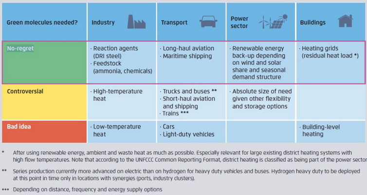 Agora Energiewende1 และ RMI2 ได้สรุปแนวทางการใช้งานไฮโดรเจนที่เหมาะสมที่สุด โดยการใช้ไฮโดรเจนเป็นแหล่งพลังงานทางเลือกที่มีการปล่อยก๊าซคาร์บอนไดออกไซด์ต่ำแทนเชื้อเพลิงฟอสซิลในภาคส่วนที่มีทางเลือกเทคโนโลยีอื่นน้อยหรือไม่มีเลย สำหรับการลดการปล่อยก๊าซคาร์บอนไดออกไซด์ หรือที่เรียกว่า No-regret hydrogen applications ดังนี้