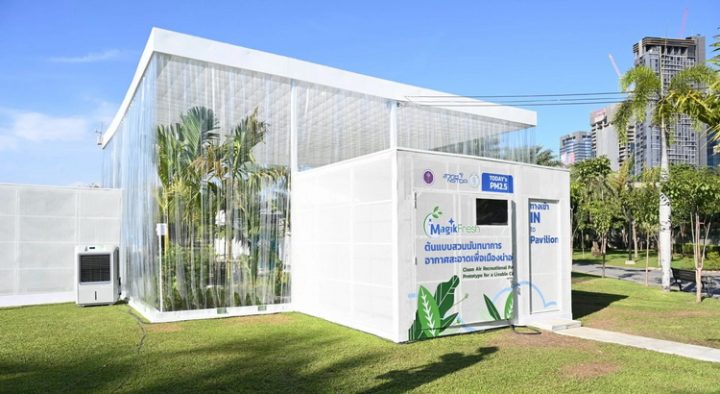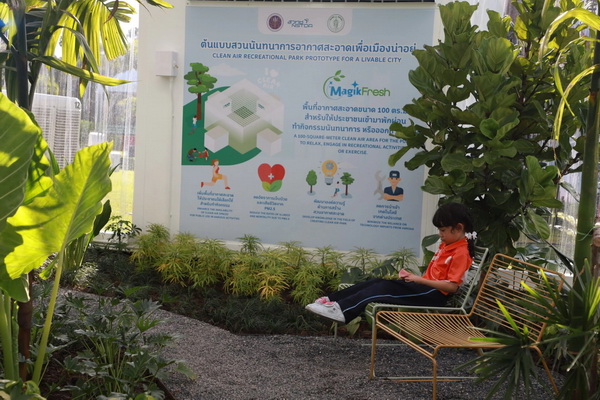 สวนอากาศสะอาดนำร่องที่สวนจตุจักรกลางกรุง เชื้อเชิญให้คนเมืองไปทดลองใช้ โดยอากาศไหลเข้าอาคารผ่านทางเครื่องกรอง อากาศไหลออกจากอาคารผ่านช่องระบายอากาศ ภายในอาคารมี PM2.5 ไม่เกินค่ามาตรฐาน หรือมีค่า AQI น้อยกว่า 50 ภายในอาคารมีอากาศไหลเวียนดีมากกว่า 10 รอบต่อชั่วโมง ปลดปล่อยก๊าซโอโซนไม่เกิน 10 ppb (เฉลี่ย 1 ชม.) แถมมีฟังก์ชันควบคุมการทำงานอัตโนมัติ ระบบกรองทำความสะอากง่าย ไม่ต้องพึ่งพาผู้เชี่ยวชาญเฉพาะทาง ไม่ต้องถอดทิ้งเปลี่ยนใหม่ ช่วยให้ลดขยะ ที่สำคัญอุปกรณ์ผลิตได้ภายในประเทศ ลดการนำเข้า