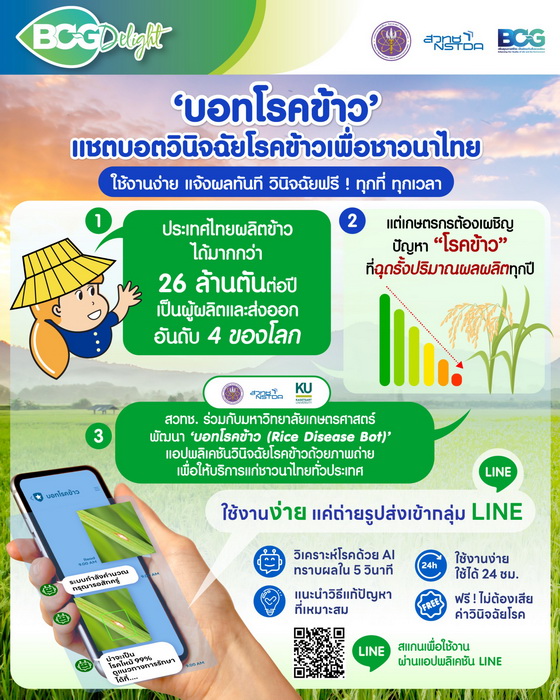 กลุ่มโปรแกรมเกษตรสมัยใหม่ สำนักงานพัฒนาวิทยาศาสตร์และเทคโนโลยีแห่งชาติ (สวทช.) สนับสนุนทุนในการดำเนินโครงการวิจัย ‘โมบายแอปพลิเคชันเพื่อการวินิจฉัยโรคข้าวโดยใช้การวิเคราะห์ภาพถ่ายและปัญญาประดิษฐ์’ ให้แก่ทีมวิจัยจาก สวทช. และมหาวิทยาลัยเกษตรศาสตร์ เพื่อดำเนินการพัฒนา ‘บอทโรคข้าว (Rice Disease Bot)’ แชตบอตสำหรับให้บริการวินิจฉัยโรคข้าวผ่านภาพถ่าย เพื่อให้คำแนะนำในการควบคุมโรคอย่างเหมาะสมและทันท่วงทีแก่เกษตรกร เป็นหนึ่งในกุญแจสำคัญที่จะช่วยปลดล็อกปัญหาการรับมือกับโรคระบาด ลดต้นทุนการใช้สารเคมีที่เสียไปอย่างไร้ค่า และยกระดับผลผลิตข้าวไทยให้มากขึ้น