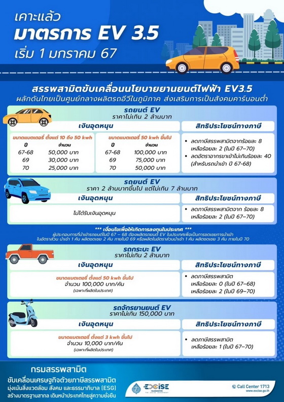 ด้าน ดร.เอกนิติ นิติทัณฑ์ประภาศ อธิบดีกรมสรรพสามิต เปิดเผยเพิ่มเติมว่า เพื่อให้การดำเนินการเปลี่ยนผ่านจากมาตรการสนับสนุนการใช้ยานยนต์ไฟฟ้า EV3 ไปสู่ EV3.5 เป็นไปอย่างราบรื่นและมีประสิทธิภาพตามเป้าหมายที่ภาครัฐกำหนด กรมสรรพสามิตได้ดำเนินการปรับปรุงหลักเกณฑ์และเงื่อนไข ข้อปฏิบัติต่าง ๆ เพื่อสนับสนุนมาตรการ EV 3.5 ในทุก ๆ ด้าน เพื่อสนับสนุนการขับเคลื่อนเศรษฐกิจของประเทศตามนโยบายของรัฐบาล และตามยุทธศาสตร์กรมสรรพสามิต ในการขับเคลื่อนเศรษฐกิจของประเทศด้วยภาษีสรรพสามิต มุ่งเน้นสิ่งแวดล้อม สังคม และธรรมาภิบาล เพื่อเดินหน้าประเทศไทยสู่ความยั่งยืน
