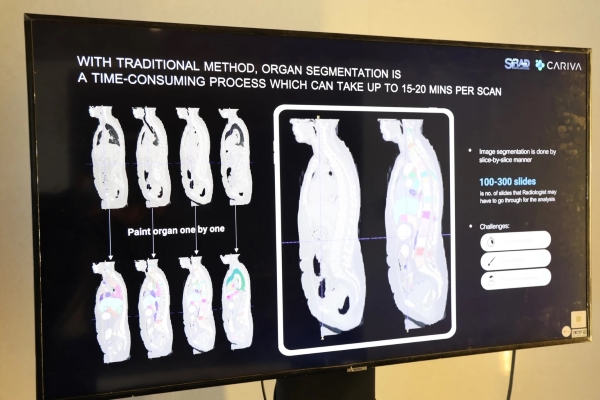 ส่วนอีกโมเดล คือ RAD Scan เป็น AI ที่ช่วยในการระบายสีภาพ X-ray/CT แบบแยกชิ้นส่วนให้เห็นอวัยวะที่แตกต่างกัน และแสดงผลออกมาในรูปแบบสามมิติ อีกทั้งยังช่วยคำนวณปริมาตรอวัยวะต่างๆ ได้โดยอัตโนมัติซึ่งจะช่วยวินิจฉัยโรคได้หลายอย่าง เช่น ภาวะสูญเสียมวลกล้ามเนื้อ (Sarcopenia) การตรวจภาวะกระดูกพรุน ซึ่งจะช่วยลดเวลาที่รังสีแพทย์ใช้ในการเตรียมภาพ (Label) และการคำนวณไปได้กว่าครึ่ง