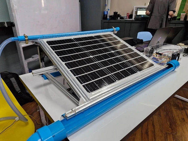“เราเลือกใช้ “ระบบวอเตอร์คูลลิ่ง” เป็นการควบคุมไม่ให้อุณหภูมิสูงเกินไป โดยการใช้น้ำในการระบายความร้อนบนตัวแผงให้อยู่ในช่วงอุณหภูมิที่เหมาะสม โดยเราจะมีการวัดอุณหภูมิของแผงโซลาร์เซลล์แต่ละแผงทุก 15 นาที ถ้าพบว่าถ้าอุณหภูมิหน้าแผงสูงกว่า 45 องศา ก็จะทำการเปิดระบบให้น้ำให้ไหลผ่านด้านบนของแผง จนอุณหภูมิลดงมาที่ 40 องศาก็จะหยุดจ่ายน้ำ”