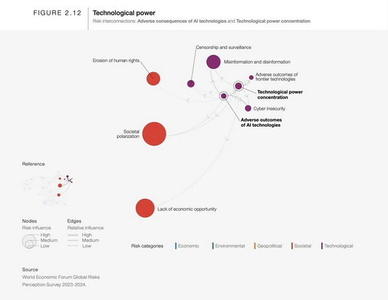 รายงานความเสี่ยงทั่วโลกปี 2024 ทำให้เกิดข้อกังวลเกี่ยวกับธรรมชาติของการพัฒนาเทคโนโลยีที่ทรงพลังและเปลี่ยนแปลงดังกล่าว โดยระบุว่า “การผลิตเทคโนโลยี AI นั้นมีความเข้มข้นสูงและความกระจุกตัวที่น่ากังวลในห่วงโซ่อุปทาน ซึ่งเป็นประโยชน์ต่อบริษัทและประเทศเพียงไม่กี่แห่ง สิ่งนี้สร้างความเสี่ยงด้านซัพพลายเชนที่สำคัญที่อาจเกิดขึ้นในทศวรรษหน้า”