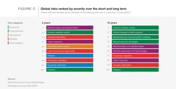 รายงานความเสี่ยงทั่วโลกของ World Economic Forum ฉบับปี 2024 จัดอันดับภัยคุกคามที่รุนแรงที่สุดที่โลกเราเผชิญในระยะสั้น (2 ปี) และยังช่วยให้เรามีมุมมองระยะยาวเกี่ยวกับภูมิทัศน์ความเสี่ยง (10 ปี)