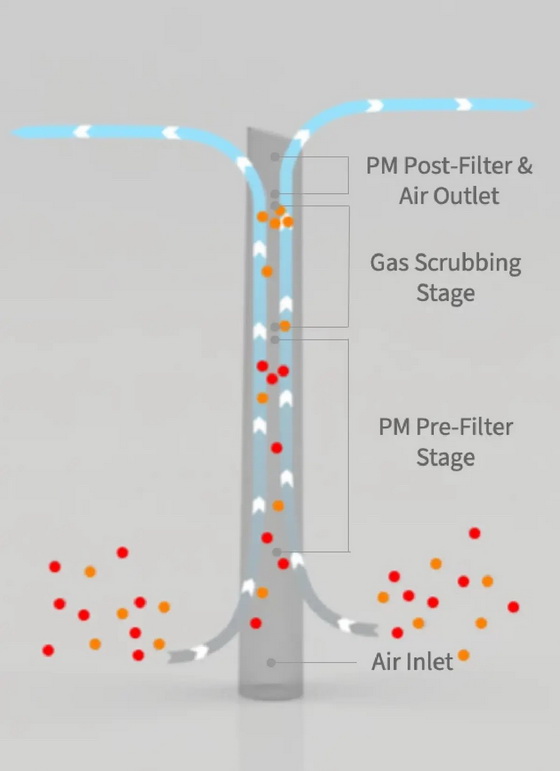 เจ้าเครื่องนี้จะสูดอากาศรอบ ๆ เข้าไป แล้วฟอกอากาศให้สะอาดบริสุทธิ์ด้วยกระบวนการขัดถู 3 ขั้นตอน โดยเป้าหมายของเครื่องนี้คือ กำจัดฝุ่น PM 2.5 หรือก๊าซจำพวกไนตรัสออกไซด์ และไวรัสที่ปนเปื้อนอยู่ในอากาศ โดยเครื่องนี้มีประสิทธิภาพการทำงานถึง 99.5%