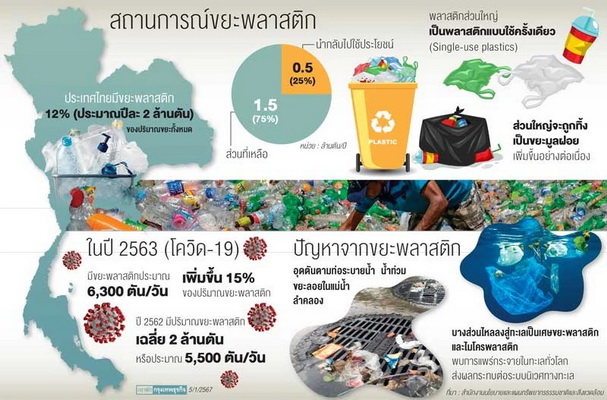 - ประเทศไทย มีปัญหาก่อขยะมากกว่า 25 ล้านตันต่อปี จัดการอย่างไม่ถูกต้องกว่า 11 ล้านตัน หรือกว่า 60% และมากกว่า 3 แสนตัน รั่วไหลสู่แหล่งน้ำ ทะเล