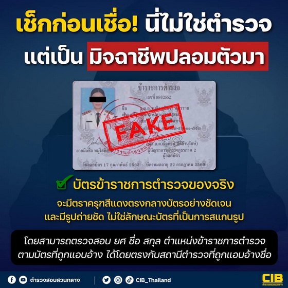 เพจตำรวจสอบสวนกลาง โพสต์ข้อความให้คำแนะนำเรื่อง “เช็กก่อนเชื่อ! นี่ไม่ใช่ตำรวจ แต่เป็นมิจฉาชีพปลอมตัวมา” ระบุว่า ปัจจุบันมีมิจฉาชีพแอบอ้างเป็นเจ้าหน้าที่ตำรวจโทรเข้ามา หรือให้แอดไลน์สถานีตำรวจ แจ้งว่าท่านเกี่ยวข้องกับการกระทำผิดกฎหมาย หรือรับแจ้งความออนไลน์ โดยมิจฉาชีพมักจะส่งบัตรข้าราชการปลอม หรือแอบอ้างว่าเป็นข้าราชตำรวจเพื่อสร้างความน่าเชื่อถือ เมื่อเหยื่อหลงเชื่ออาจมีการขอข้อมูลส่วนตัวอ้างว่าเพื่อการสอบสวน สุดท้ายกลับให้โอนเงินเพื่อตรวจสอบ ตำรวจสอบสวนกลาง (CIB) จึงจะขอแนะนำวิธีการสังเกตบัตรข้าราชการตำรวจของจริง ดังนี้