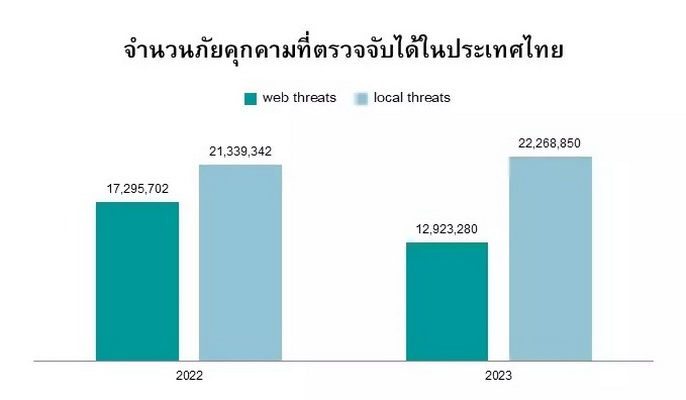 รายงานของแคสเปอร์สกี้ เปิดเผยว่า ในปี 2023 ผลิตภัณฑ์ของแคสเปอร์สกี้ตรวจพบความพยายามในการคุกคามเว็บจำนวน 12,923,280 รายการบนคอมพิวเตอร์ของผู้ใช้ในประเทศไทยที่เข้าร่วม Kaspersky Security Network (KSN) ซึ่งถือว่ามีสัดส่วนน้อยกว่าปีที่แล้ว 25.28 เปอร์เซ็นต์ หรือคิดเป็น 17,295,702 รายการ