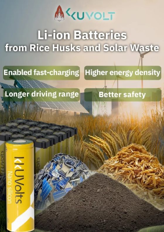 ประเทศไทยมีแกลบเป็นของเหลือทิ้งทางการเกษตรปริมาณมหาศาล แต่ถูกนำไปใช้ในอุตสาหกรรมมูลค่าไม่สูงมากและมูลค่าเหล่านั้นไม่ได้กลับไปสู่เกษตรกรหรือผู้ผลิตโดยตรง รวมถึงมีขยะโซล่าร์เซลล์ที่หมดอายุการใช้งานราว 4,000 ตัน ในปี 2565 และคาดการณ์ว่าอีก 20 ปีข้างหน้าขยะโซลาร์เซลล์จะมีปริมาณเพิ่มขึ้นถึงหลักล้านตัน มารีไซเคิลเป็นขั้วไฟฟ้าในแบตเตอรี่จากส่วนประกอบสำคัญอย่าง “ซิลิกอน”