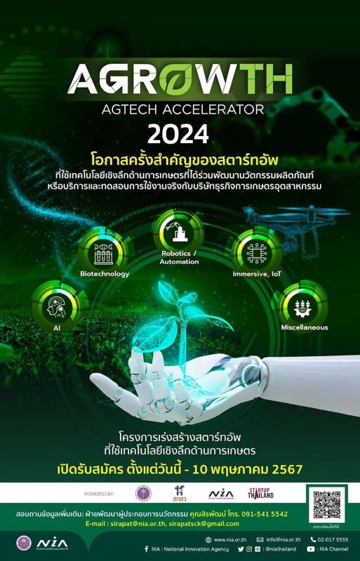 นอกจากนี้ ดร.กริชผกา บุญเฟื่อง ผู้อำนวยการ NIA ยังเผยถึงมูลค่าการลงทุนในตลาดสตาร์ทอัพเกษตรที่มีอยู่กว่า 5.1 หมื่นล้านดอลล่าร์สหรัฐ หรือราว 1.7 ล้านล้านบาท โดยปีนี้ NIA ยังคงผลักดันให้เกิดสตาร์ทอัพด้านการเกษตรในระบบนิเวศอย่างต่อเนื่องผ่านโครงการ AGROWTH ซึ่งจะเปิดรับสมัครสตาร์ทอัพที่ใช้เทคโนโลยีเชิงลึกด้านการเกษตรที่มีศักยภาพเข้าร่วมโครงการ เพื่อพัฒนาผลิตภัณฑ์หรือบริการ ทดสอบการใช้งานจริง ตลอดจนปรับเปลี่ยนรูปแบบธุรกิจให้สอดคล้องกับความต้องการของภาคเกษตรร่วมกับบริษัทชั้นนำในภาคธุรกิจการเกษตร ซึ่งเปิดรับสมัครตั้งแต่วันนี้ถึง 10 พฤษภาคม 2567