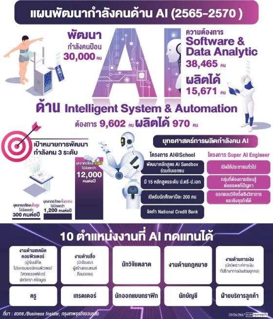 สวทช.สำรวจความต้องการและผลิตบุคลากรเพื่อส่งเสริมระบบเศรษฐกิจ AI ปี 2563-2567 พบว่าความต้องการกำลังคนด้าน Software & Data Analytic 38,465 คน ขณะที่ปัจจุบันผลิตได้ 15,671 คน จึงต้องมีแผนพัฒนากำลังคนด้านAI เพื่อป้อนภาคธุรกิจและภาครัฐให้ได้ 30,000 คน ภายในปี 2570