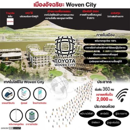 โตโยต้า (TOYOTA) เผยความคืบหน้าการสร้างเมืองอัจฉริยะ “โวเว่น ซิตี้” (Woven City) บริเวณภูเขาฟูจิ ประเทศญี่ปุ่น เป้าหมายหลักเพื่อทดสอบเทคโนโลยีล้ำสมัยและตอบโจทย์เมืองยุคดิจิทัล ไม่ว่าจะเป็น โดรน หุ่นยนต์ AI ระบบอัตโนมัติ เปิดตัวครั้งแรกในปี 2564 กำหนดการก่อสร้างเฟสแรกให้เสร็จสิ้นปี 2567 คาดว่าเมืองจะพร้อมใช้งานอย่างเต็มรูปแบบในปี 2573 เงินทุนก่อสร้างรวมเบ็ดเสร็จ 10,000 ล้านดอลลาร์ หรือราว 360,000 ล้านบาท