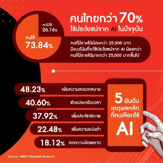 - BBDO Bangkok เผยผลสำรวจ คนไทยเกินครึ่ง ใช้ AI ในชีวิตประจำวัน ยิ่งรายได้สูง ยิ่งใช้ AI เยอะ แต่ยังกังวลเรื่องความปลอดภัยของข้อมูลส่วนตัว