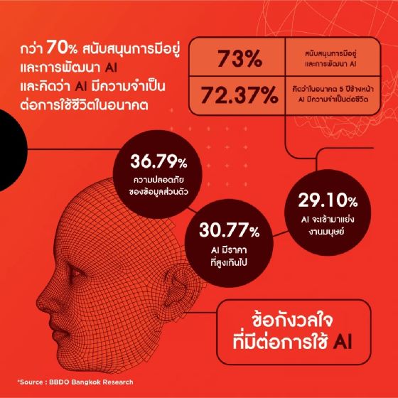 ในอนาคตข้างหน้า AI กับบทบาทในชีวิตมากขึ้น ไม่ต่างอะไรกับ โทรศัพท์มือถือกับคนในโลกปัจจุบันตอนนี้ นั่นทำให้ BBDO Bangkok ไปสำรวจเจาะลึกความคิดเห็นผู้บริโภคไทยแบบ insight สุุดๆ และพฤติกรรมการใช้ AI จากกลุ่มตัวอย่างกว่า 400 คนในกรุงเทพและหัวเมืองหลักๆ ทั่วประเทศ ซึ่งแสดงให้เห็นถึงความคิด ความเข้าใจที่มีต่อ AI และพฤติกรรมการนำ AI มาใช้ในชีวิตประจำวันของคนไทยในปัจจุบัน
