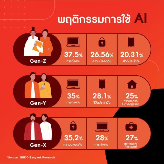 ผลของการสำรวจวิจัยเกี่ยวกับ AI ยังบอกอีกว่า แต่ละ Generation ก็มีเรื่องให้ใช้ AI ที่แตกต่างกันไป กลุ่ม Gen Z และ Gen Y ใช้ AI กับการทำงานมากที่สุด (37.5% และ 35.5%)