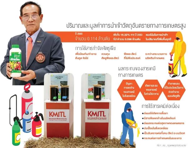 กองติดตามประเมินผลสิ่งแวดล้อม สำนักงานนโยบายและแผนทรัพยากรธรรมชาติและสิ่งแวดล้อม เผยแพร่ข้อมูลรายงานกรมวิชาการเกษตรในปี 2565 พบว่าปริมาณและมูลค่าการนำเข้าวัตถุอันตรายทางการเกษตรสูงถึง 0.114 ล้านตัน เพิ่มขึ้นร้อยละ 16.32 จาก พ.ศ. 2563 ที่มีการนำเข้ารวม 0.098 ล้านตัน