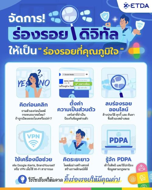 สำนักงานพัฒนาธุรกรรมทางอิเล็กทรอนิกส์ (สพธอ.) หรือ ETDA (เอ็ตด้า) มุ่งส่งเสริมให้คนไทยทุกกลุ่มเกิดการใช้ดิจิทัลอย่างรู้เท่าทันและปลอดภัย โดยโครงการ ETDA Digital Citizen (EDC) จะพาทุกคนไปทำความรู้จัก และตระหนักถึงความสำคัญของ Digital Footprint ที่เป็นหนึ่งเนื้อหาภายใต้หลักสูตร EDC Plus เพื่อให้เข้าใจ พร้อมรับมือและจัดการกับร่องรอยดิจิทัลได้อย่างถูกวิธียิ่งขึ้น
