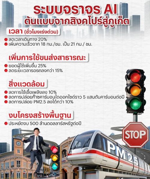 ปลายเดือนกุมภาพันธ์ที่ผ่านมา นายโสภณ สุวรรณรัตน์ ผู้ว่าราชการจังหวัดภูเก็ต ให้สัมภาษณ์กับโพสต์ทูเดย์ ประเด็นการจัดการรถติดในภูเก็ต และเผยนโยบายสำคัญประการหนึ่งคือ ‘การนำเทคโนโลยี AI มาใช้ควบคุมระบบจราจรทั้งหมด ซึ่งมีต้นแบบระบบจากประเทศสิงคโปร์’ ซึ่งปัจจุบันทางภูเก็ตได้มีการสำรวจแยกต่างๆ เพื่อติดต้องกล้องและระบบเป็นที่เรียบร้อย คาดว่าจะลดปัญหาจราจรได้ราว 30-40% ภายใต้งบประมาณ 400 ล้านบาท (อ่านเพิ่มเติม : กางแผนจัดการรถติด “ภูเก็ต“ เส้นทางพิเศษ-จังหวัดแรกใช้ AI ควบคุมระบบจราจร)