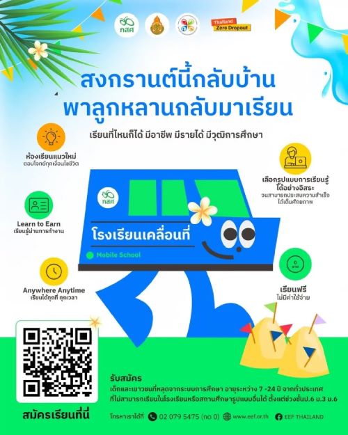 ทั้งนี้ กสศ. ได้จัดแคมเปญรณรงค์ “สงกรานต์นี้ กลับบ้าน พาลูกหลานกลับมาเรียน” เชิญชวน ครอบครัว พี่น้องแรงงานที่กำลังกลับบ้านรวมถึง คนไทยทุกคน บอกต่อข้อมูลโอกาสและทางเลือกการศึกษา ไปให้ถึงครอบครัวเด็กและเยาวชนที่หลุดจากระบบการศึกษา หรือกำลังตัดสินใจจะไม่เรียนต่อ