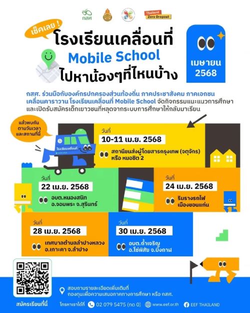คาราวานโรงเรียนเคลื่อนที่ Mobile School จะได้ตามวันเวลาและสถานที่ ดังต่อไปนี้