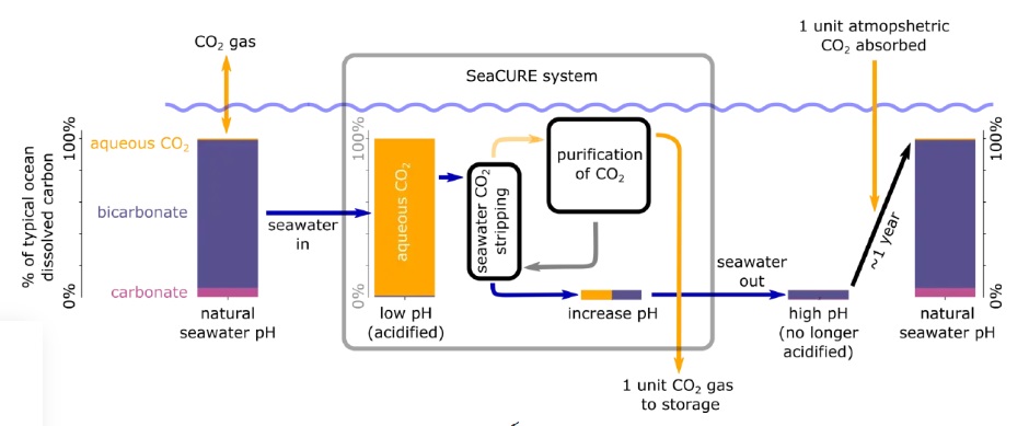 ก๊าซคาร์บอนไดออกไซด์ที่ลอยขึ้นสู่บรรยากาศจะถูกดูดออกไปและทำให้เข้มข้นขึ้น โดยใช้กาบมะพร้าวที่ไหม้เกรียม เพื่อเพิ่มความเข้มข้น ทำให้เกิดกระแสคาร์บอนไดออกไซด์ที่พร้อมสำหรับการจัดเก็บอย่างปลอดภัย ส่วนน้ำทะเลที่มีคาร์บอนต่ำจะถูกเติมด่างลงไปเพื่อทำให้มีค่าเป็นกลาง จากนั้นจึงถูกสูบกลับออกไปในลำธารที่ไหลลงสู่ทะเล เมื่อกลับสู่ทะเลแล้ว น้ำทะเลจะเริ่มดูดซับคาร์บอนจากชั้นบรรยากาศมากขึ้น ซึ่งช่วยลดก๊าซเรือนกระจกได้ แต่ปริมาณก๊าซคาร์บอนไดออกไซด์ที่โครงการนี้กำจัดกันกลับอยู่ที่ไม่เกิน 100 เมตริกตันต่อปี น้อยกว่าการปล่อยก๊าซเรือนกระจกของเครื่องบินที่บินข้ามมหาสมุทรแอตแลนติกเสียอีก หากพิจารณาจากขนาดของมหาสมุทรทั่วโลกแล้ว นักวิจัยของ SeaCURE ยังเชื่อว่าเทคโนโลยีนี้มีศักยภาพ