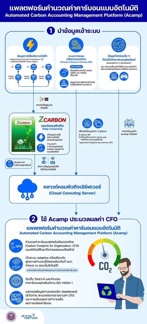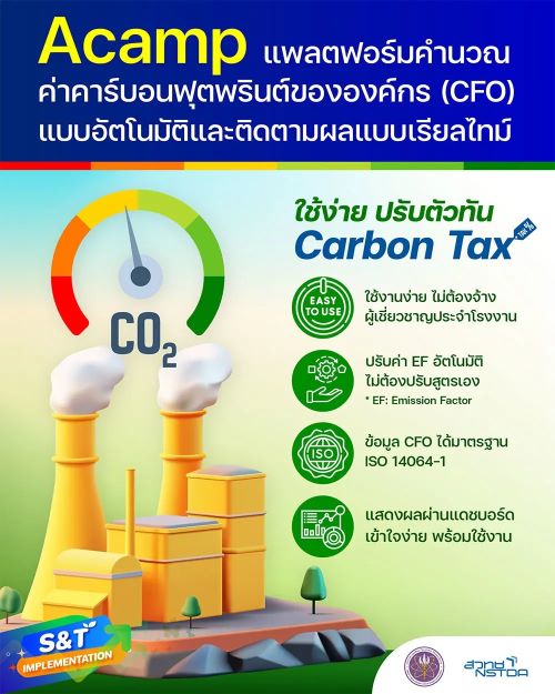 เพื่อลดภาระดังกล่าวให้ผู้ประกอบการไทย กระทรวงการอุดมศึกษา วิทยาศาสตร์ วิจัยและนวัตกรรม (อว.) โดยศูนย์เทคโนโลยีอิเล็กทรอนิกส์และคอมพิวเตอร์แห่งชาติ (เนคเทค) สำนักงานพัฒนาวิทยาศาสตร์และเทคโนโลยีแห่งชาติ (สวทช.) ได้พัฒนา Automated Carbon Accounting Management Platform (Acamp) หรือเอแคมป์ แพลตฟอร์มคำนวณคาร์บอนฟุตพรินต์ หรือ CFO แบบอัตโนมัติและติดตามผลแบบเรียลไทม์ พร้อมแสดงผลข้อมูลในรูปแบบแดชบอร์ด (dashboard) ที่เข้าใจง่าย พร้อมใช้งาน การคำนวณค่า CFO สอดคล้องกับ GHG Protocol และค่า EF ของอุตสาหกรรมไทย